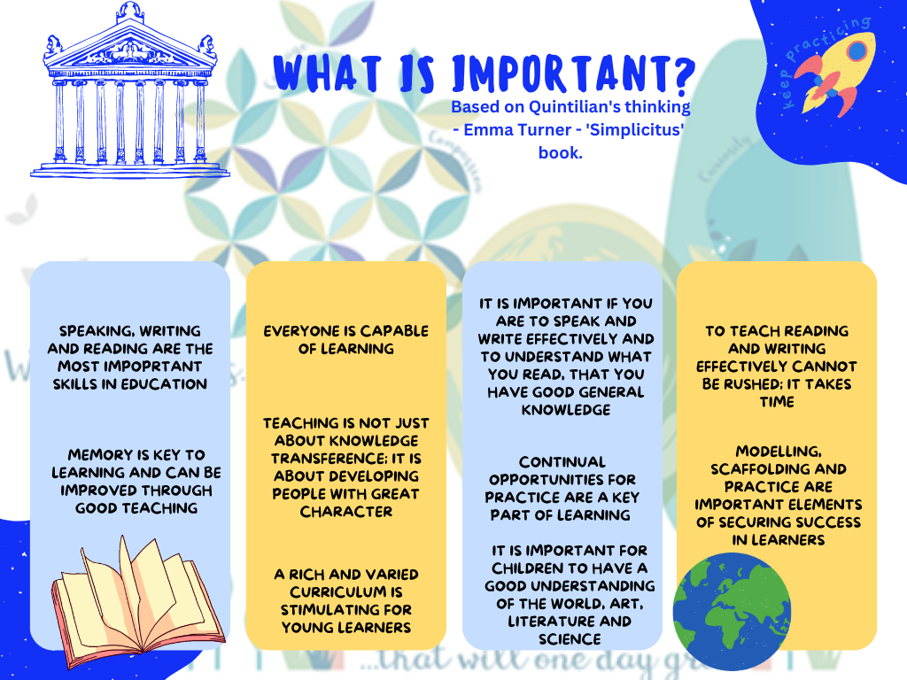 In order to develop and refine our curriculum offer, we read 'Simplicitus' by Emma Turner, which is based on Quintilian's thinking around education. We explored, What is learning? How are skills and knowledge acquired? We identified the key learning for each subject and each year group - the 'bread and butter' of our curriculum. We highlighted practice and memory as important to our pupils' learning experiences. Our curriculum is, in the words of educationalist, Mary Myatt, 'A never-ending story' - we are always refinining and enhancing.