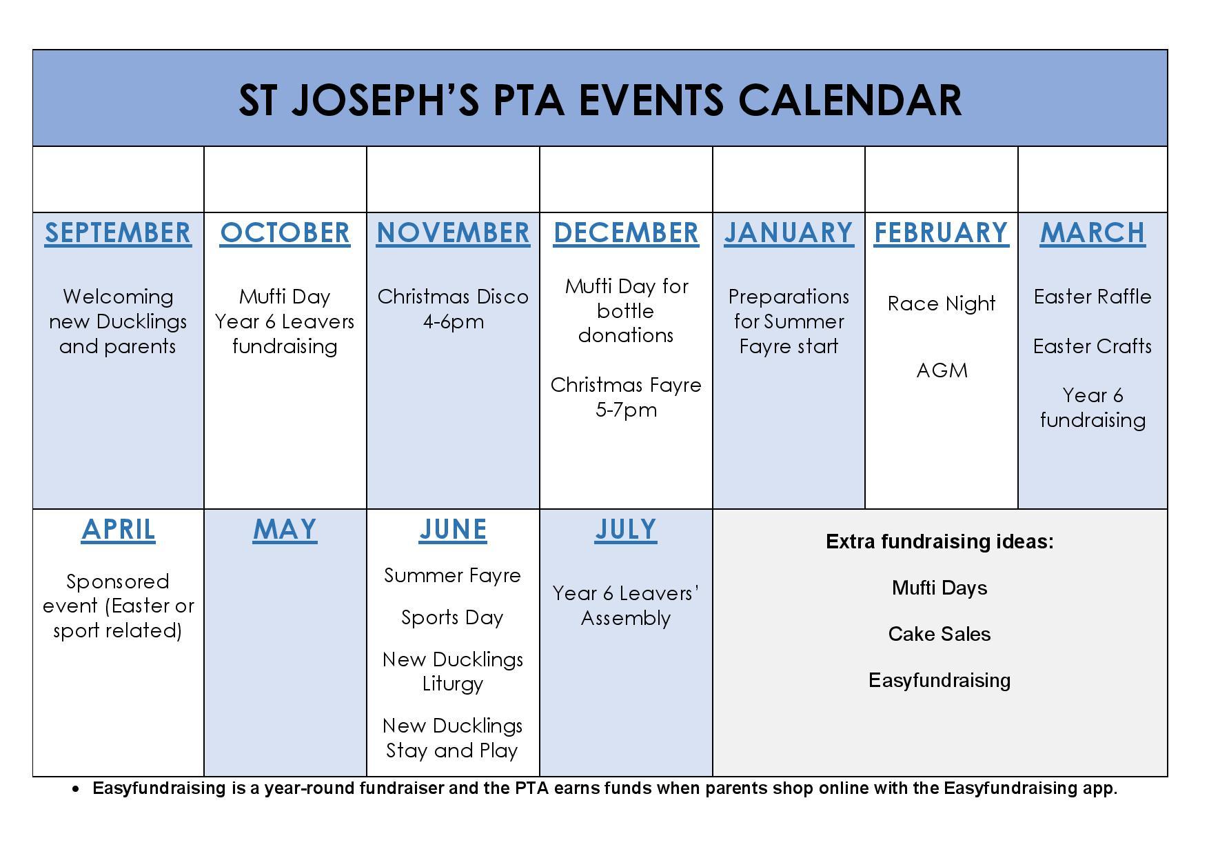 Please see the below example of our PTA Events Calendar. Events can change each year and the months they are held in can vary. We welcome any new ideas so please feel free to come along to our PTA meetings!