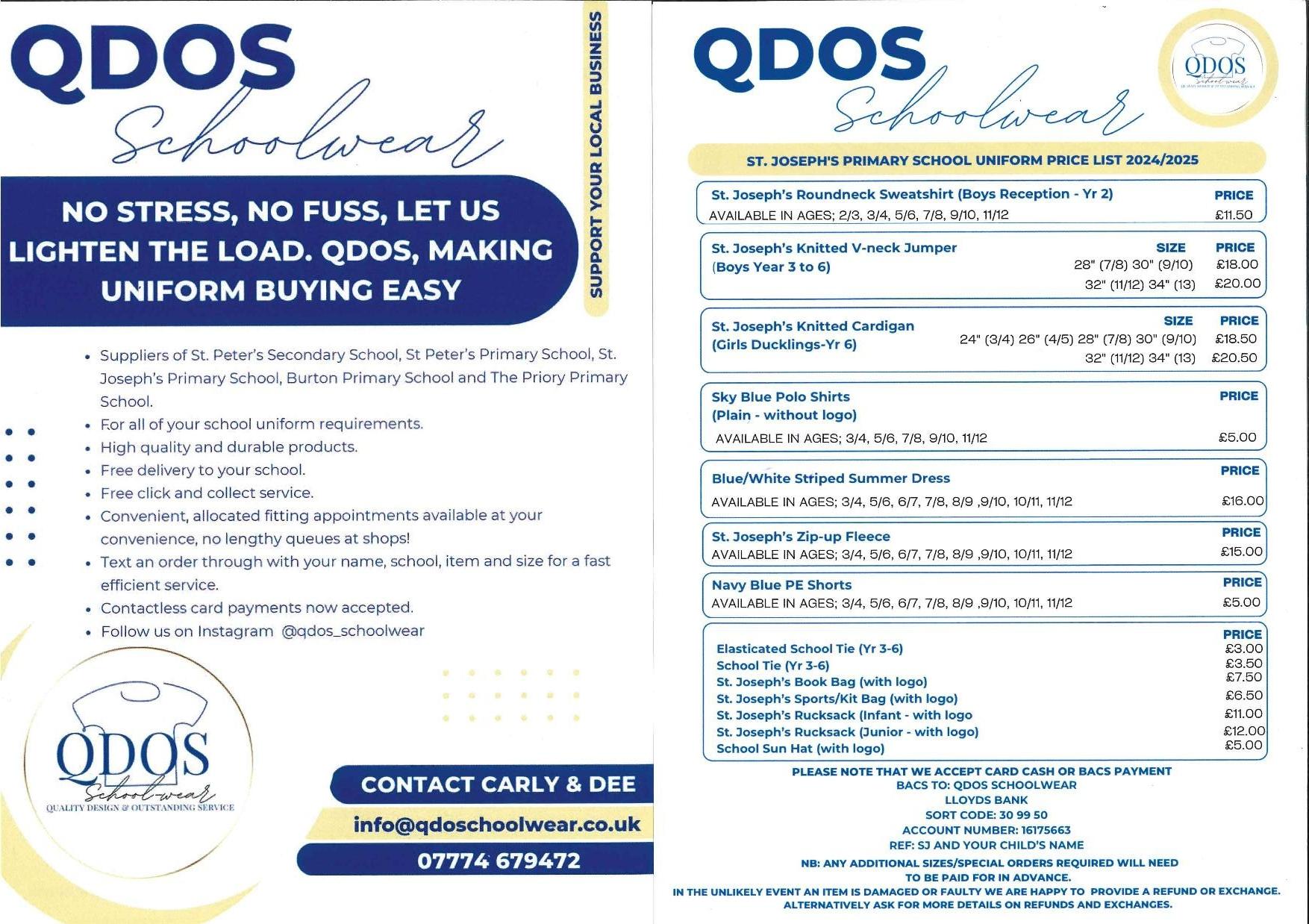 QDOS, our school uniform supplier, is able to provide items with the school logo, including the jumper/cardigan, and girls’ summer dresses. Contact details for Dee or Carly at QDOS are 07774 679472 or email info@qdoschoolwear.co.uk.